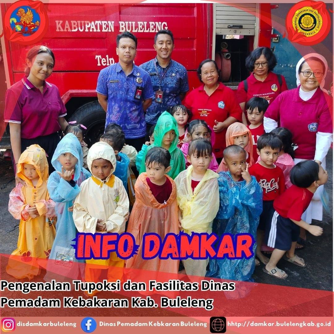 Selasa, 14/10 Dinas Pemadam Kebakaran dan Penyelamatan Buleleng melalui Bidang Pencegahan melaksanakan kegiatan sosialisasi dengan topik "Pengenalan Tupoksi dan Fasilitas Dinas Pemadam Kebakaran dan Penyelamatan Kabupaten Buleleng" kepada siswa-siswi TK Santa Maria Singaraja yang berjumlah 100 orang, serta memberikan edukasi tentang pencegahan kebakaran awal tentang kebocoran gas LPG 3kg kepada orang tua siswa.