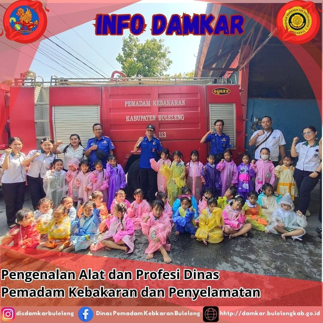 Senin, 13/10 Dinas Pemadam Kebakaran dan Penyelamatan Buleleng melalui Bidang Pencegahan melaksanakan kegiatan sosialisasi dengan topik "Pengenalan Tupoksi dan Fasilitas Dinas Pemadam Kebakaran dan Penyelamatan Kabupaten Buleleng" kepada siswa-siswi TK Aura Sukma Insani Singaraja yang berjumlah 70 orang.