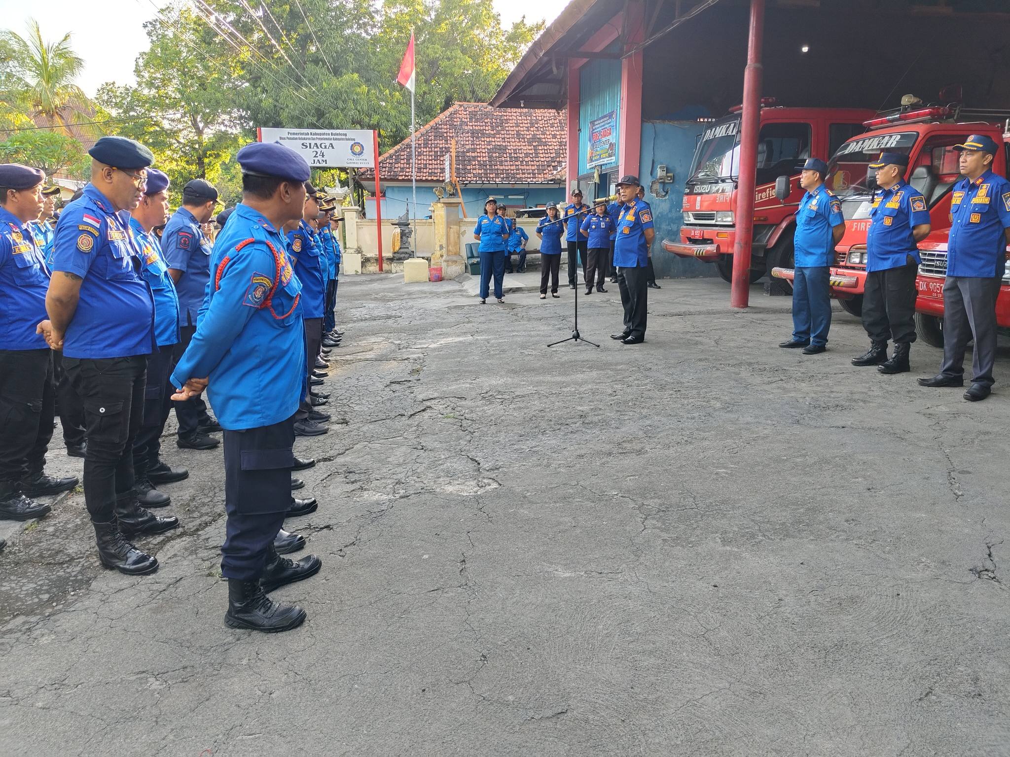 Pelaksanaan apel pagi pada Dinas Pemadam Kebakaran dan Penyelamatan Kabupaten Buleleng dilaksanakan dalam rangka menegakkan disiplin, mengecek kehadiran, dan menyampaikan informasi penting atau arahan kerja sebelum beraktivitas. Kegiatan rutin ini juga berfungsi meningkatkan kekompakan, memotivasi pegawai, dan membangun karakter tanggung jawab serta loyalitas terhadap instansi/organisasi. Apel pagi pada Hari Senin, 6 April 2026 dipimpin langsung oleh Kepala Dinas Pemadam Kebakaran dan Penyelamatan Kabupaten Buleleng, Bapak I Gede Arya Suardana, AP.MM. Dalam arahannya diantaranya beliau menyampaikan terkait pelaksanaan Work From Home ( WFH) bagi aparatur pemerintah daerah setiap hari jumat sebagaimana tertuang dalam SE Bupati Buleleng Nomor B.100.3.4.1/949/ORG SETDA/IV/2026 sesebagai tindaklanjut SE PermenpanRB No 8 Tahun 2026 dan SE Mendagri Nomor 800.1.5/3349/SJ.